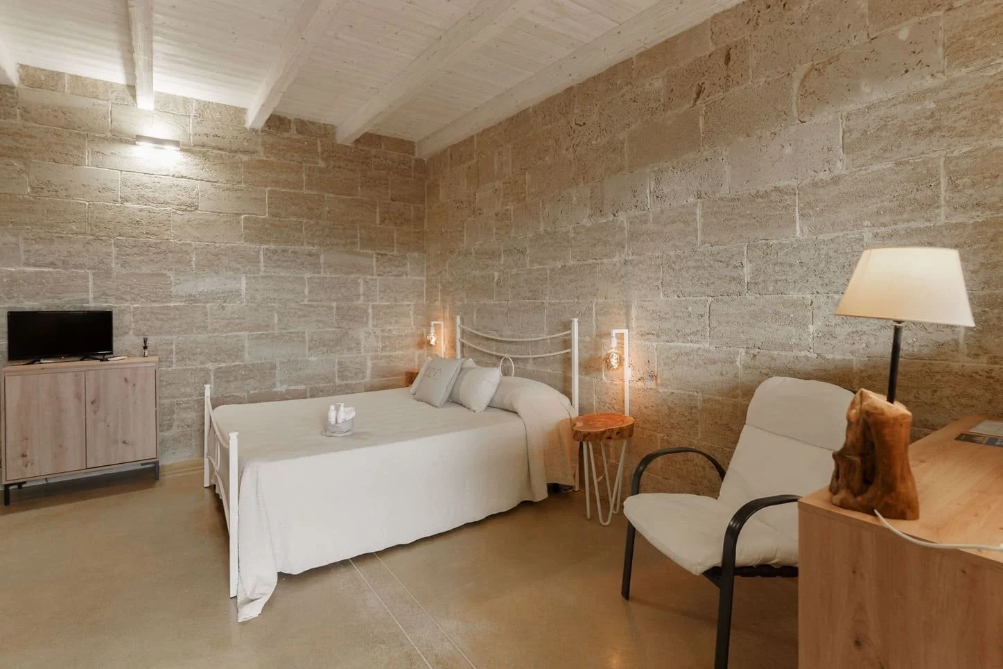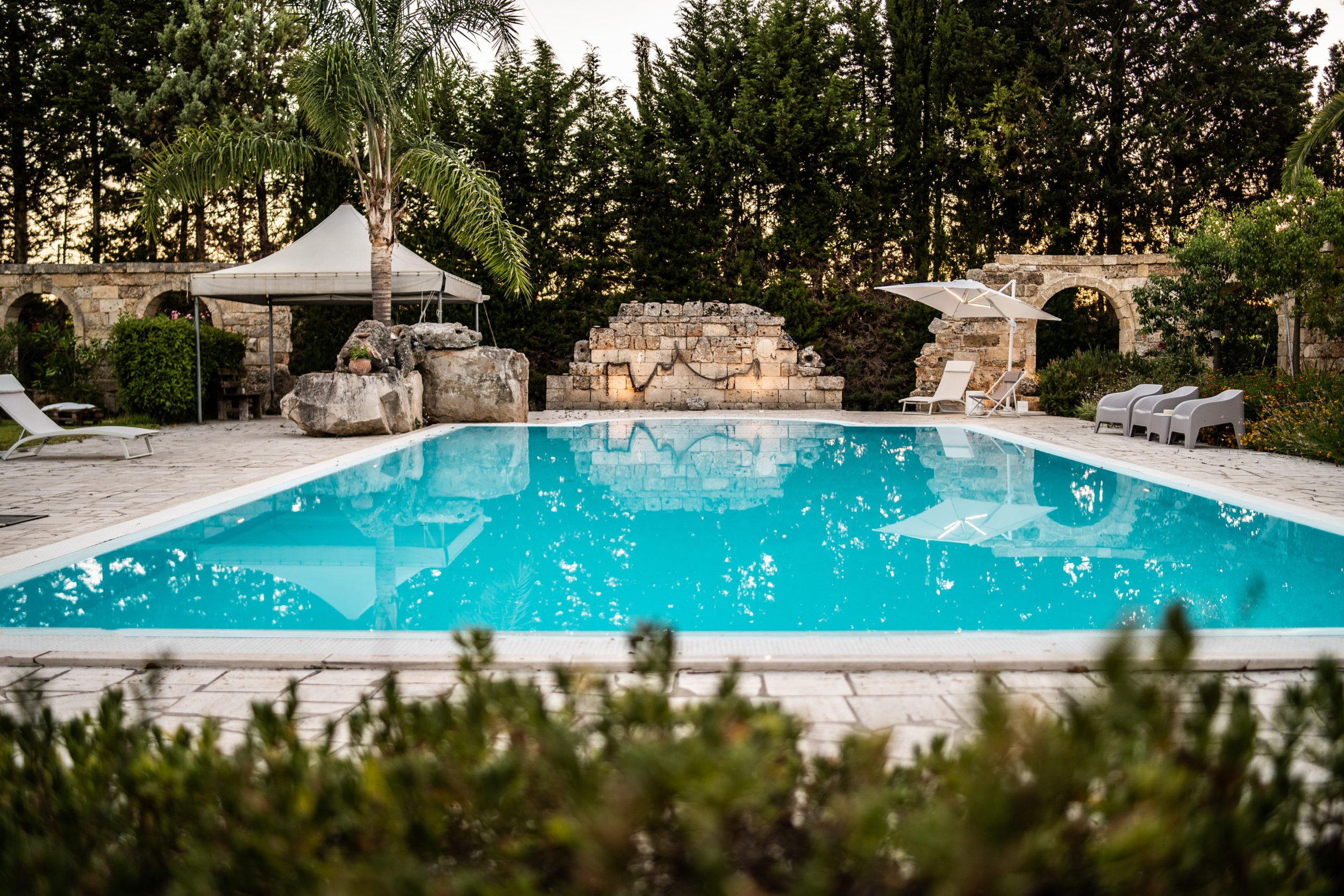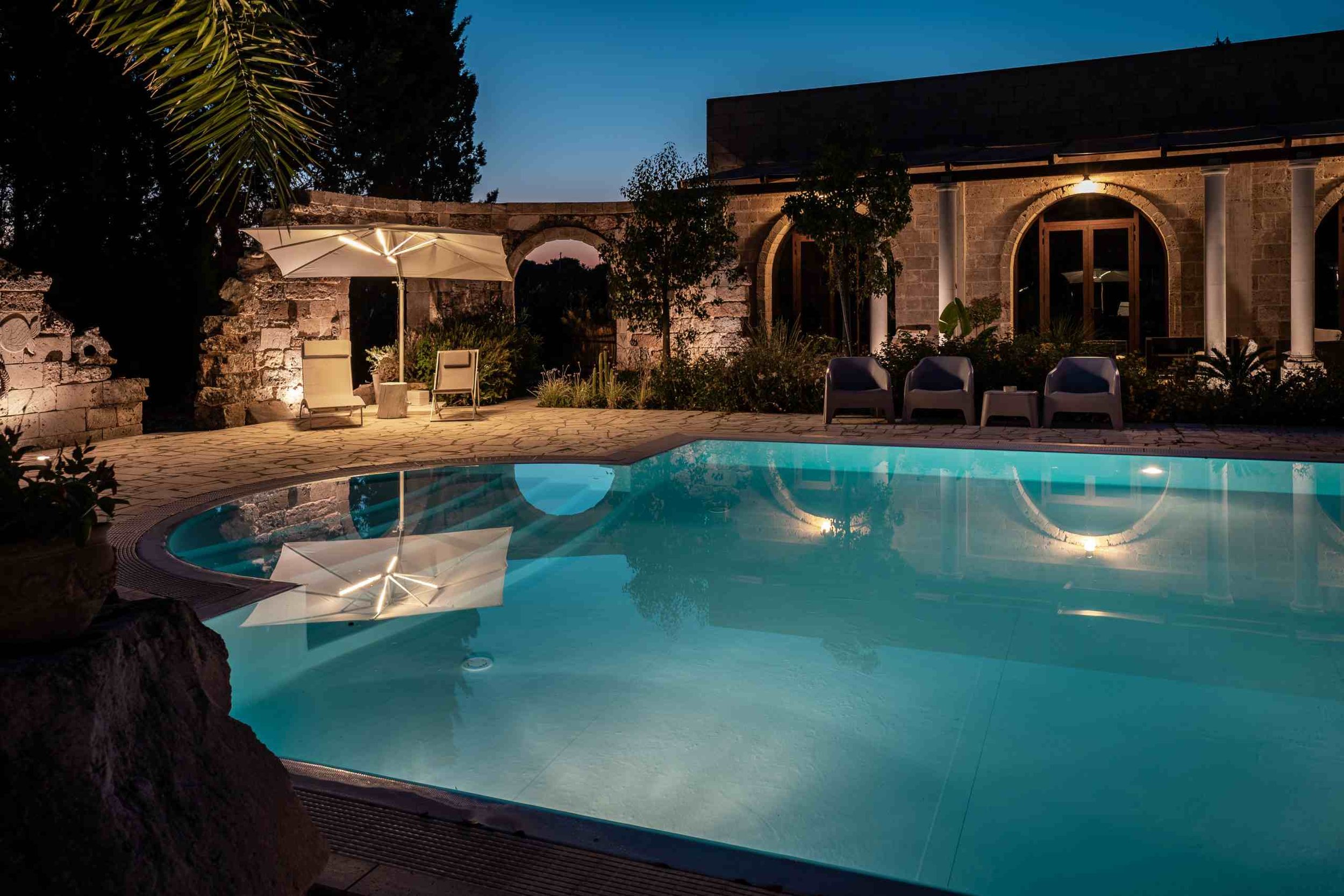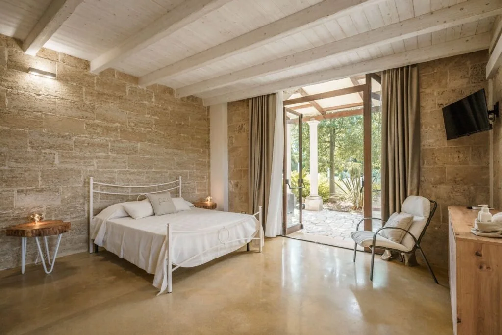 The estate offers five elegant rooms inspired by trees native to the Salento landscape, each thoughtfully designed to reflect the beauty of nature that surrounds the property. From every room, guests enjoy peaceful views of palms, ancient olive trees, pines, and fig trees.